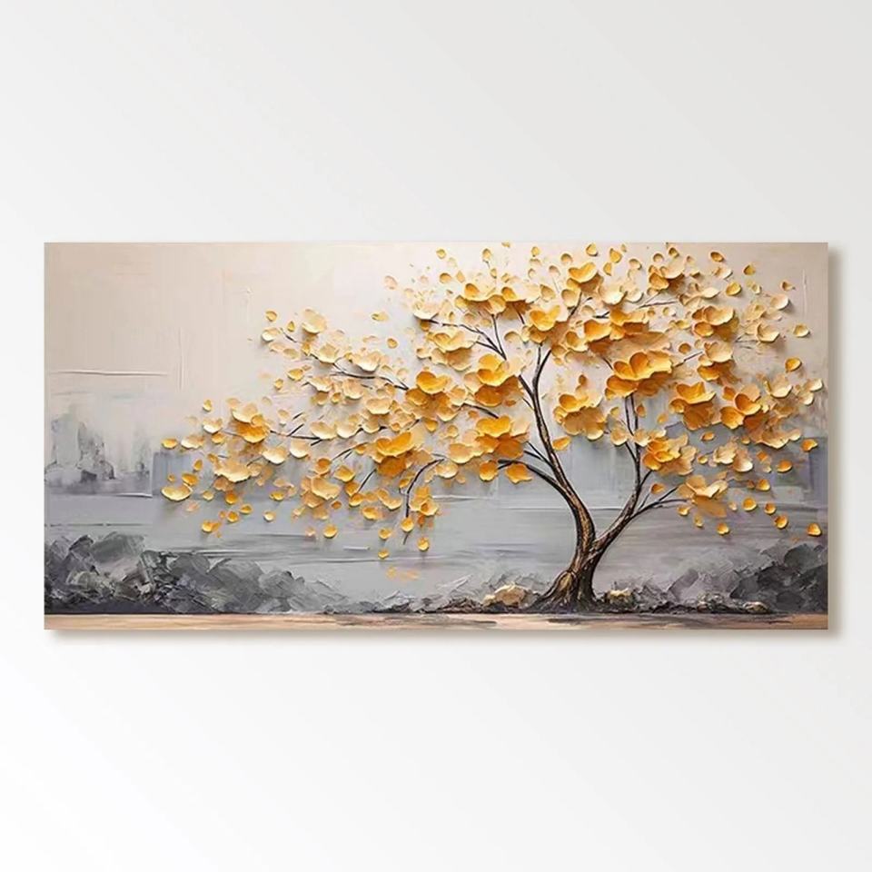 Grande peinture murale moderne encadrée sur toile, motif arbre doré texturé en acrylique, pour chambre et galerie