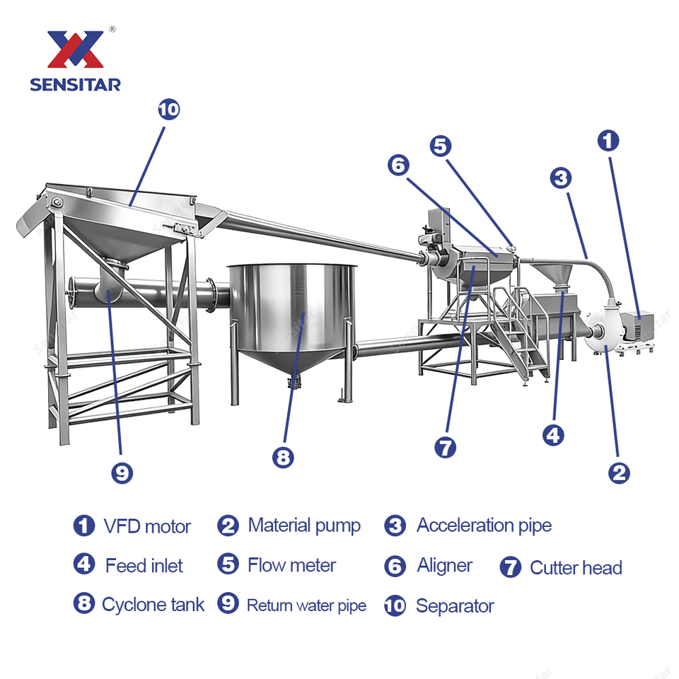 Moteur VFD, Pompe à matériaux, Tuyau d'accélération, Entrée d'alimentation, Débitmètre, Aligneur, Tête de coupe, Réservoir Cyclone, Tuyau de retour d'eau, SéparateurComposants de base