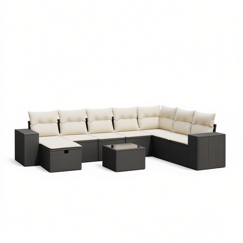 Ensemble de canapés de jardin en rotin noir, mobilier de patio extérieur, design moderne, résistant aux UV, grand canapé modulaire avec rangement et table basse