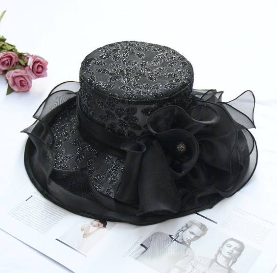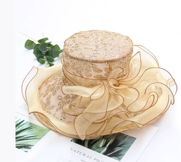 Chapeau de soleil à fleurs perlées en organza à larges bords pour femmes adapté à l'été Bord de mer Protection solaire Chapeau en mousseline de soie