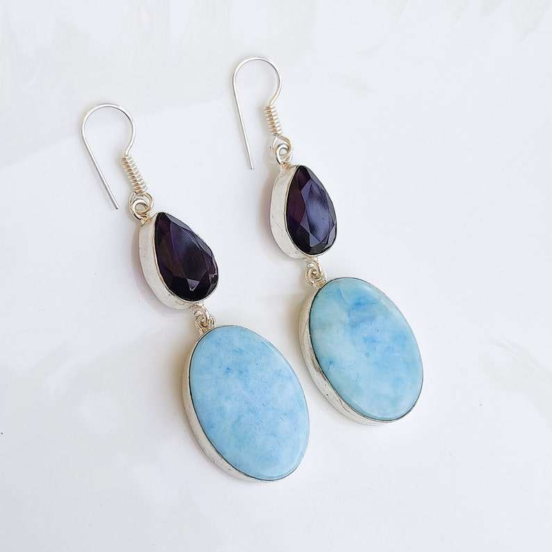 Boucles d'oreilles pendantes multi-pierres Larimar, fil d'oreille plaqué argent, boucles d'oreilles en cristal, bijoux bohèmes faits à la main, cadeau pour maman, cadeau pour elle