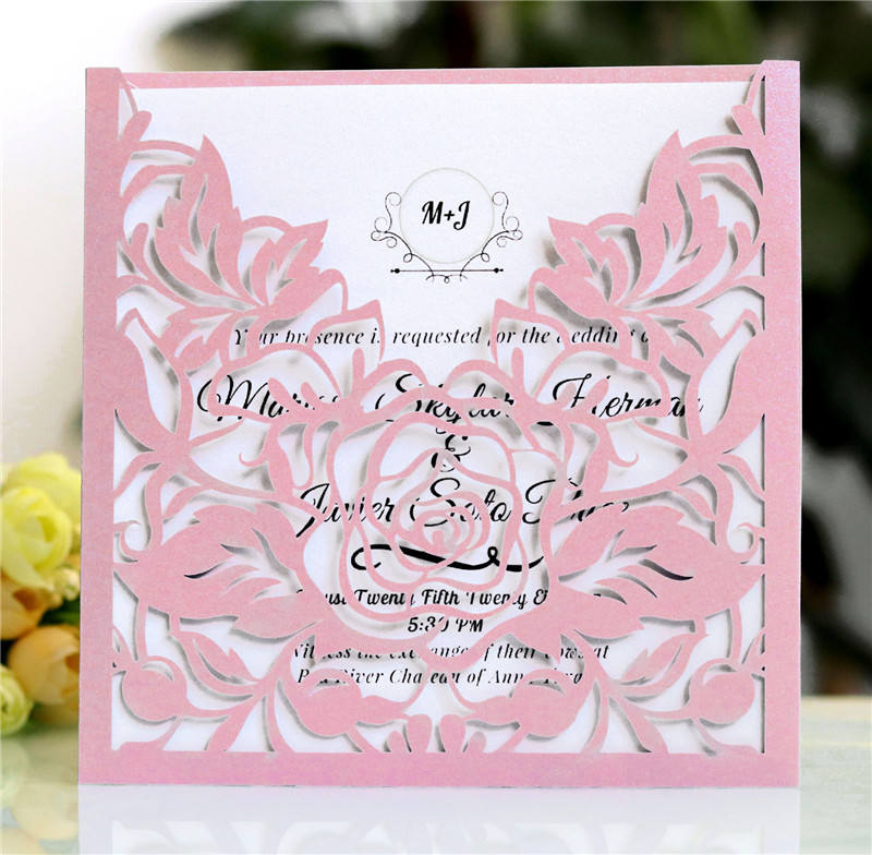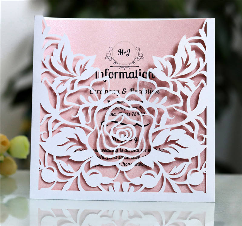 Carte d'invitation carrée à fleur découpée au Laser, cartes de vœux personnalisée pour Mariage, baptême anniversaire, 50 pièces