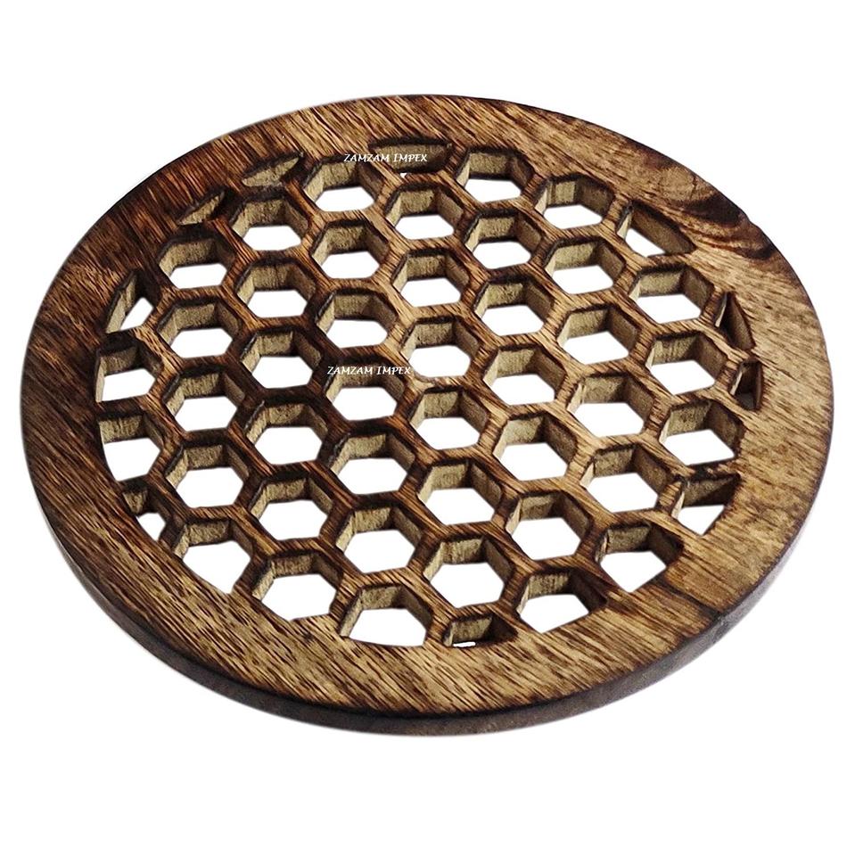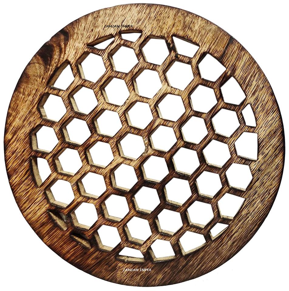Dessous de plat en bois de manguier rond en nid d'abeille découpé au laser Tapis de table écologique et résistant à la chaleur Design campagnard Diamètre de 6 pouces