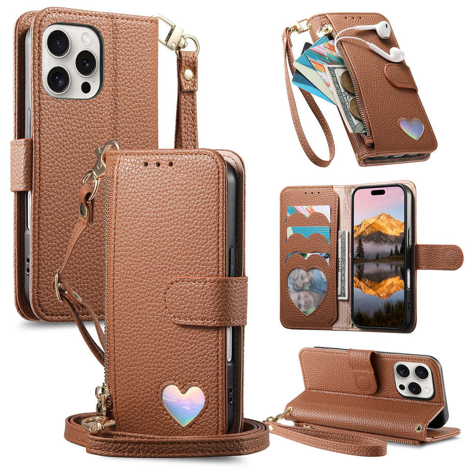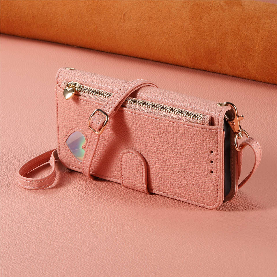 Étui à rabat en cuir PU avec fermeture magnétique, motif cœur laser, cordon long, couleur unie, fente pour cartes, pour téléphone