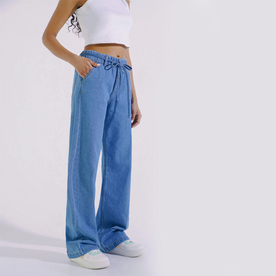 Dernière 2023 Pantalon en jean droit à jambe large lavé à la pierre bleu profond pour femmes avec cordons et poches à vendre