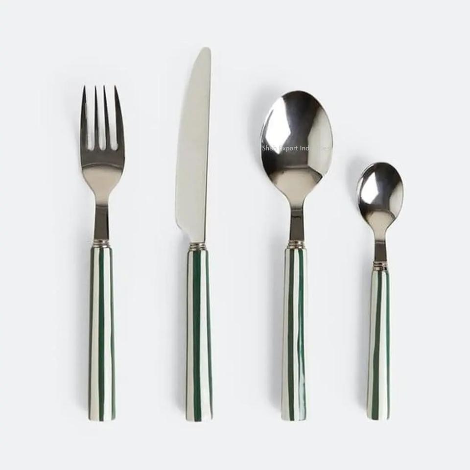 Dernier lot de couverts en métal argenté 2025 avec poignée en résine au design vert et blanc pour ensemble de couverts de table de mariage