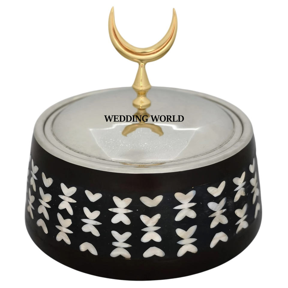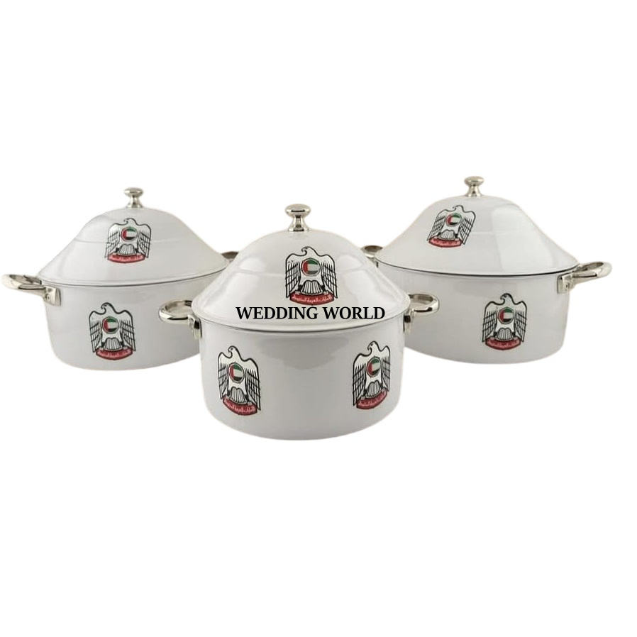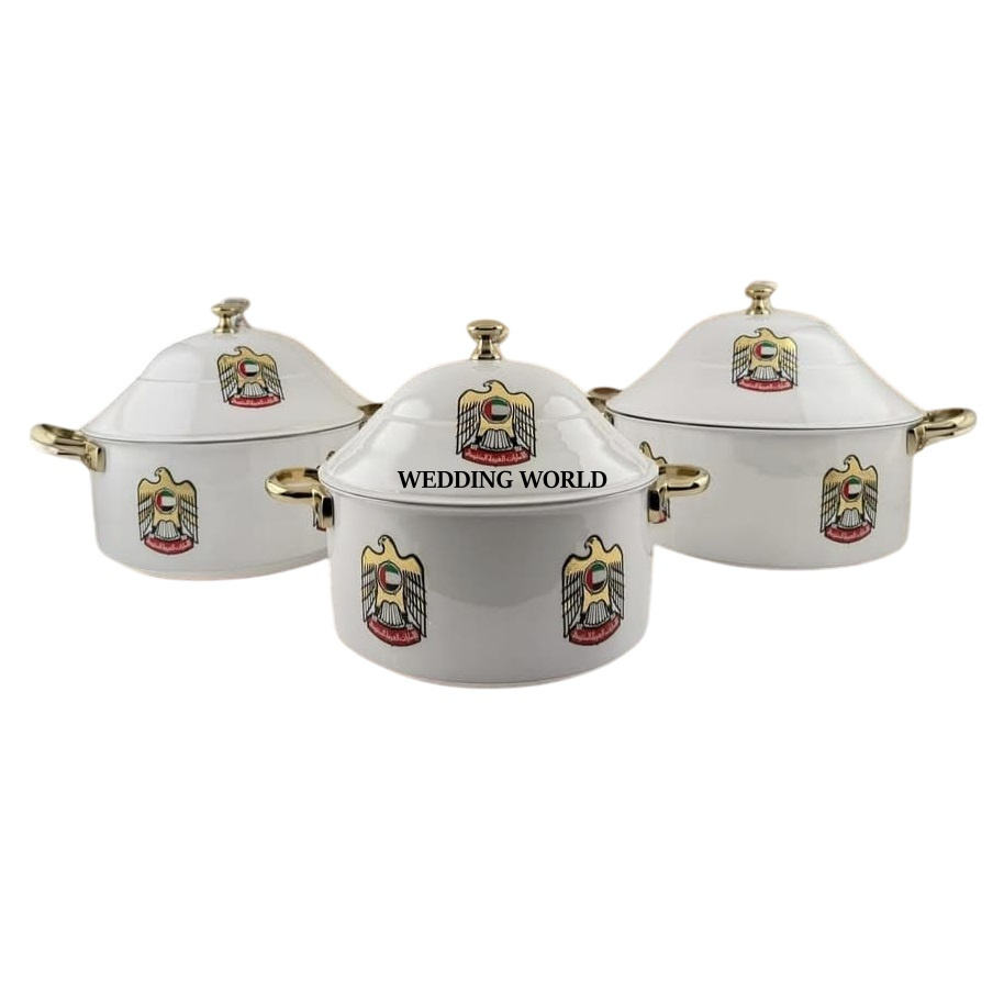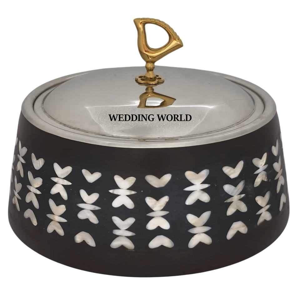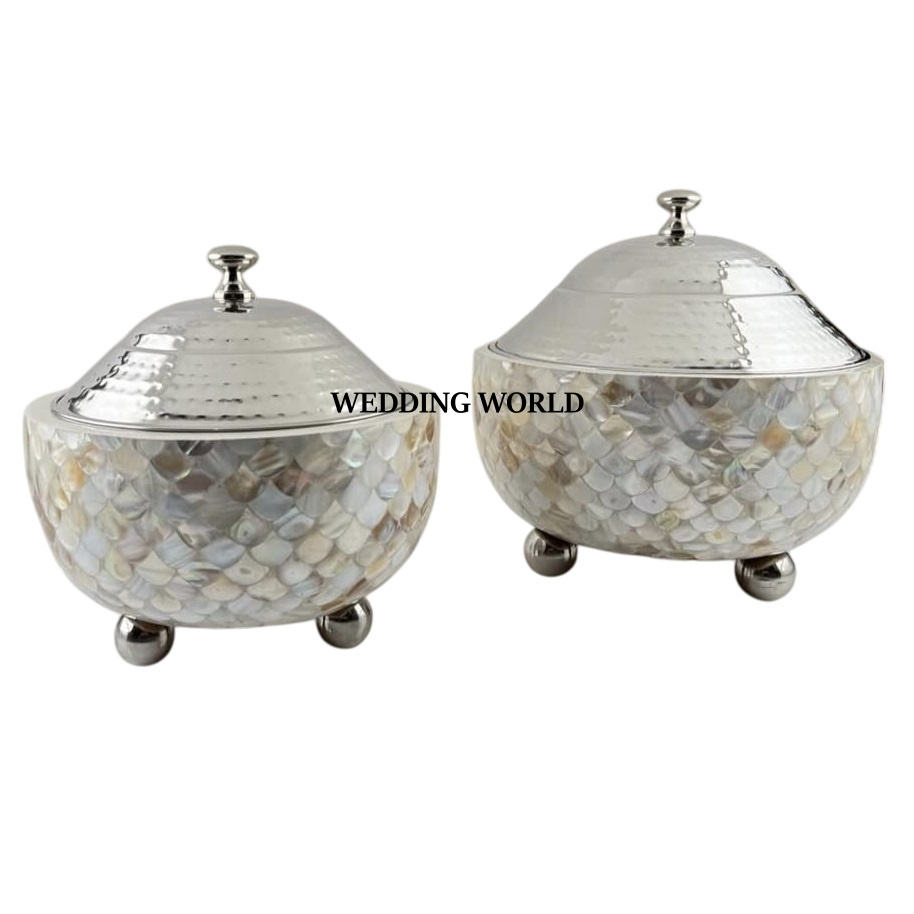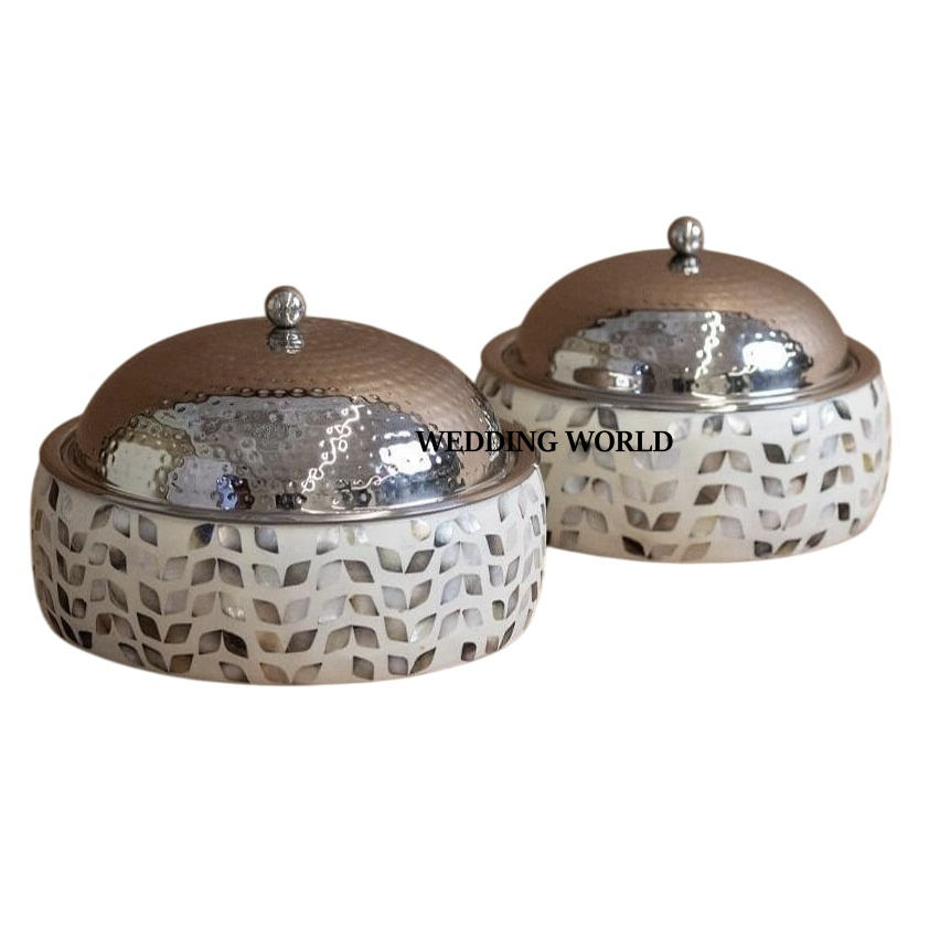 Dernière collection de marmites en nacre Ensemble de deux casseroles de vaisselle Forme ronde Dessus de table Vente en gros Réchauffeur d'aliments en métal fantaisie
