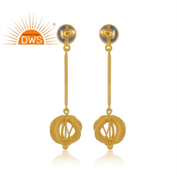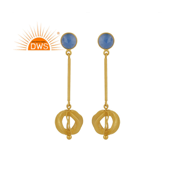 Dernier modèle de boucles d'oreilles pendantes en calcédoine bleue naturelle plaquée or 18 carats Fabricant de bijoux fins