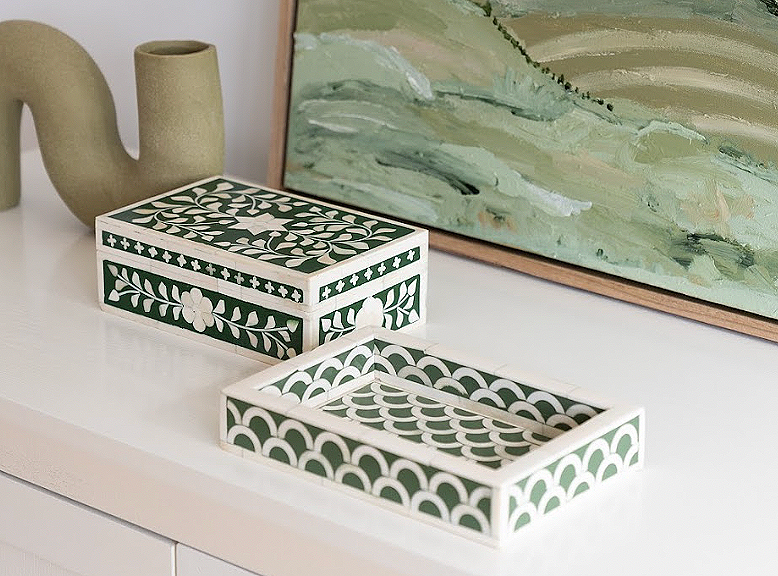 Boîte d'incrustation d'os dernière conception pour boîte à bijoux décorative étagère d'incrustation d'os faite à la main verte pour la maison boîte de décoration pour la vente chaude