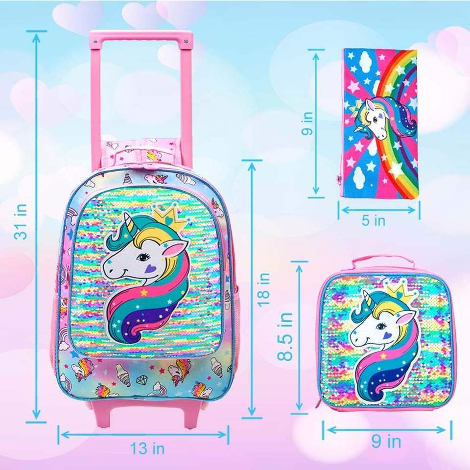 Dernier modèle de sac à dos à roulettes dessin animé Sac à roulettes grande capacité licorne Sac à lunch 3 en 1 Ensemble de sacs d'école pour filles