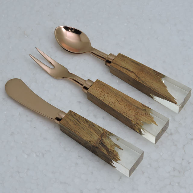 Couverts dernier modèle manche en résine et bois et acier inoxydable avec ustensiles de cuisine plaqués or de haute qualité