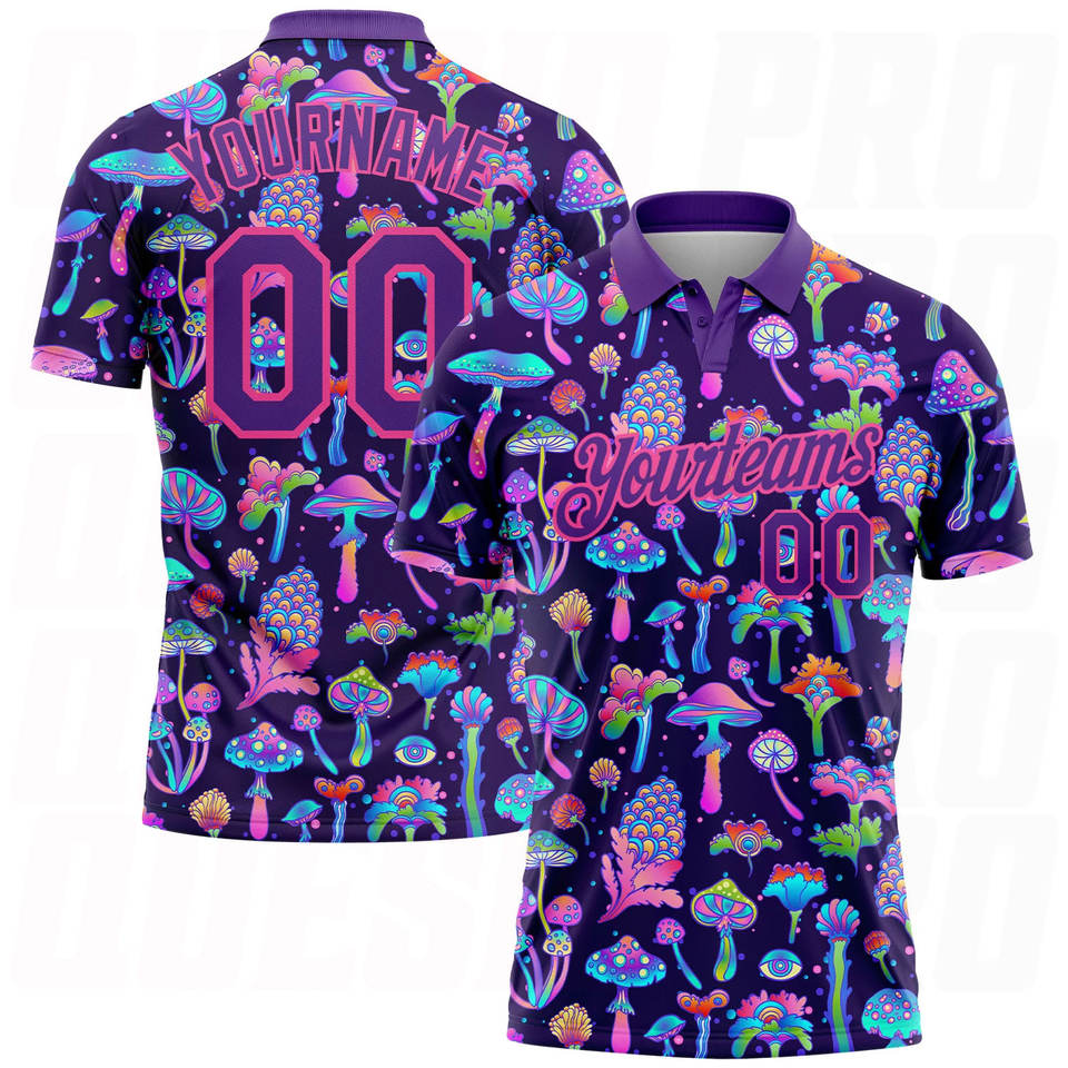 Chemise polo de golf à manches courtes, dernier design, séchage rapide, imprimé par sublimation, motif champignon magique violet rose
