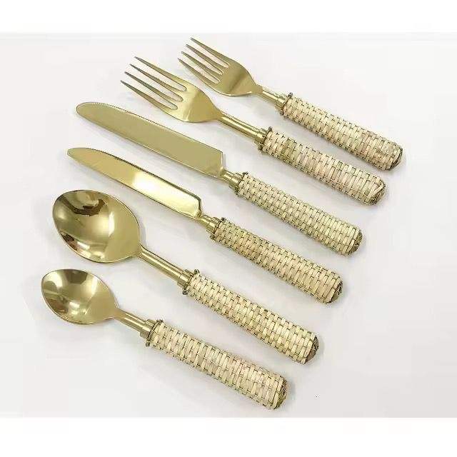 Dernier design Ensemble de couverts en acier inoxydable avec poignée en rotin et osier Ensemble de couverts personnalisés Vaisselle Couverts de mariage personnalisés