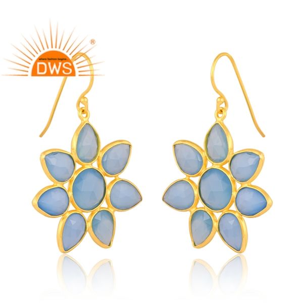 Dernière conception de boucles d'oreilles en argent sterling plaqué or 18 carats en calcédoine bleue naturelle avec pierres précieuses Demi Fine Jewelry Manufacturer