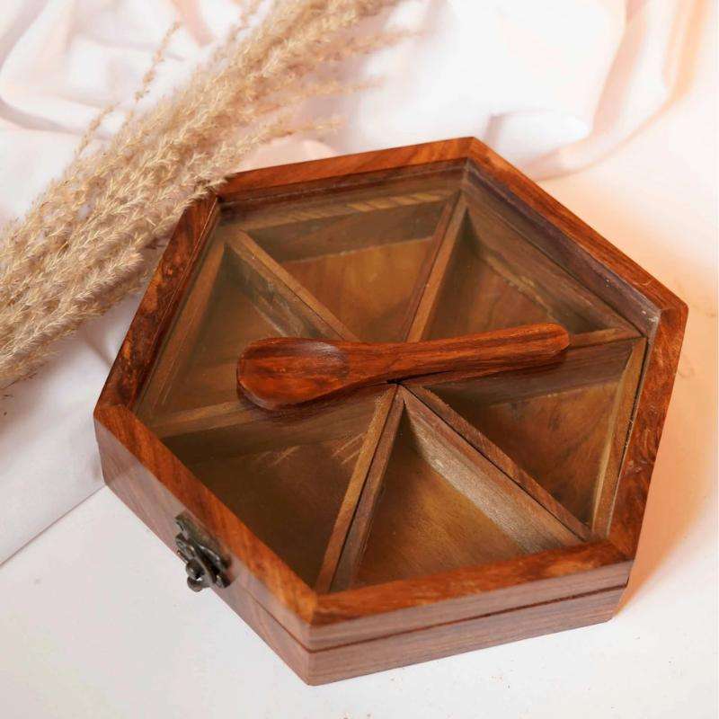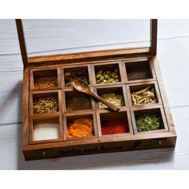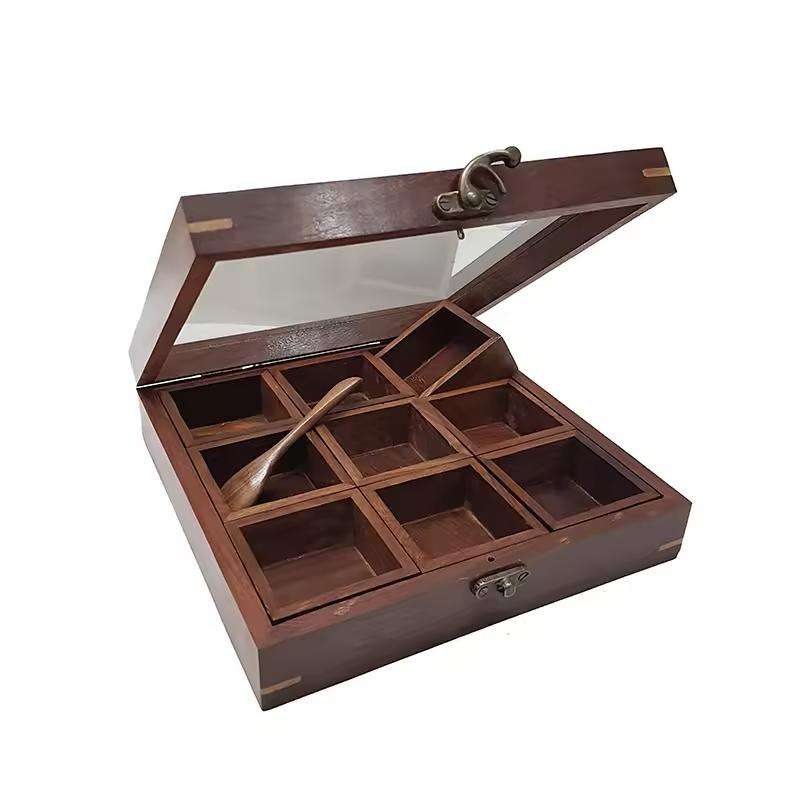 Dernière conception de boîte à épices en bois finie boîte de rangement utilitaire forme carrée boîtes de haute qualité usage polyvalent de l'Inde