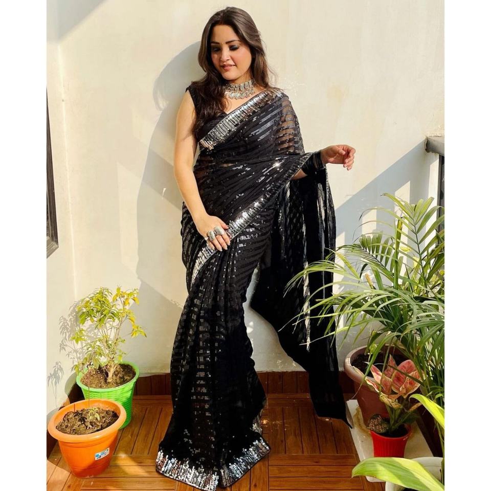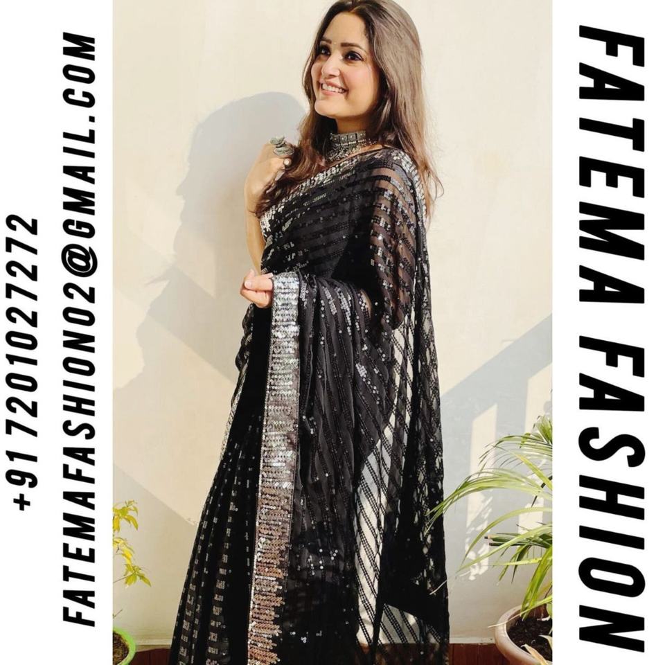 Dernier modèle de sari en fausse fourrure non cousu avec bordure en dentelle fantaisie et broderie pour les occasions spéciales par Fatema Fashion