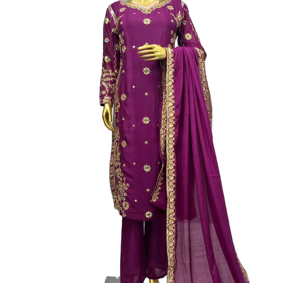 Ensemble Kurti de travail de broderie de soie chinon lourd de dernier concepteur par FabZone