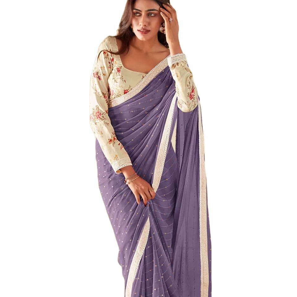 Sari pour femmes pour occasions spéciales, dernier modèle, en soie géorgette lourde, tissage uni, bordure riche en pallu