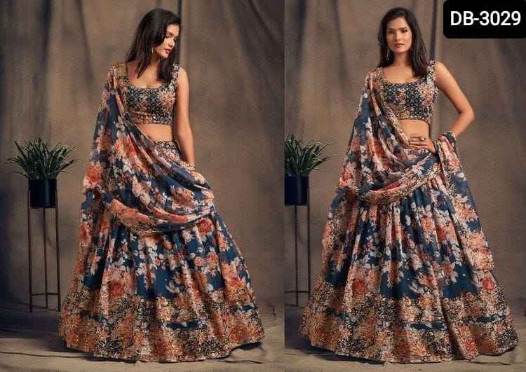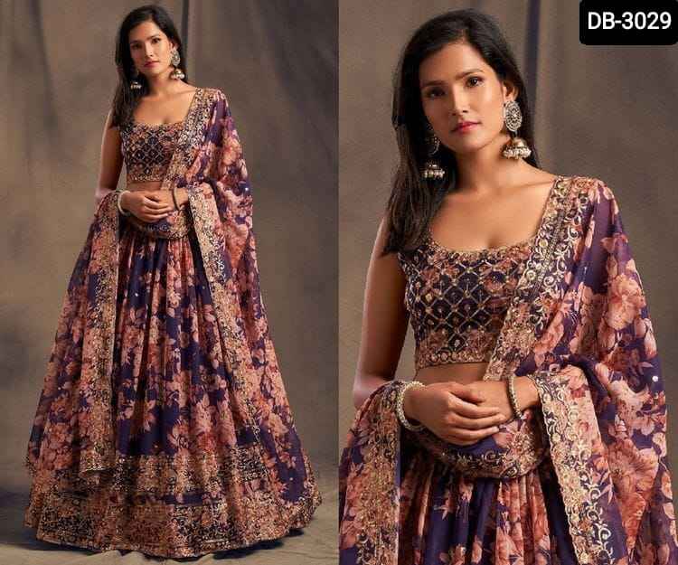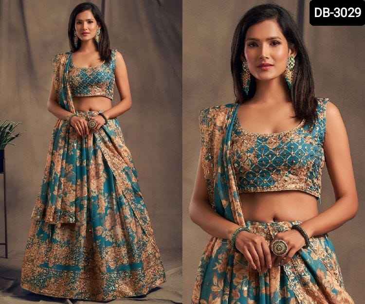 Dernier modèle de Lehenga Choli de créateur, richement orné de sequins Zari, avec imprimé numérique et bordure brodée en organza doux et élégant, pour tenue de soirée