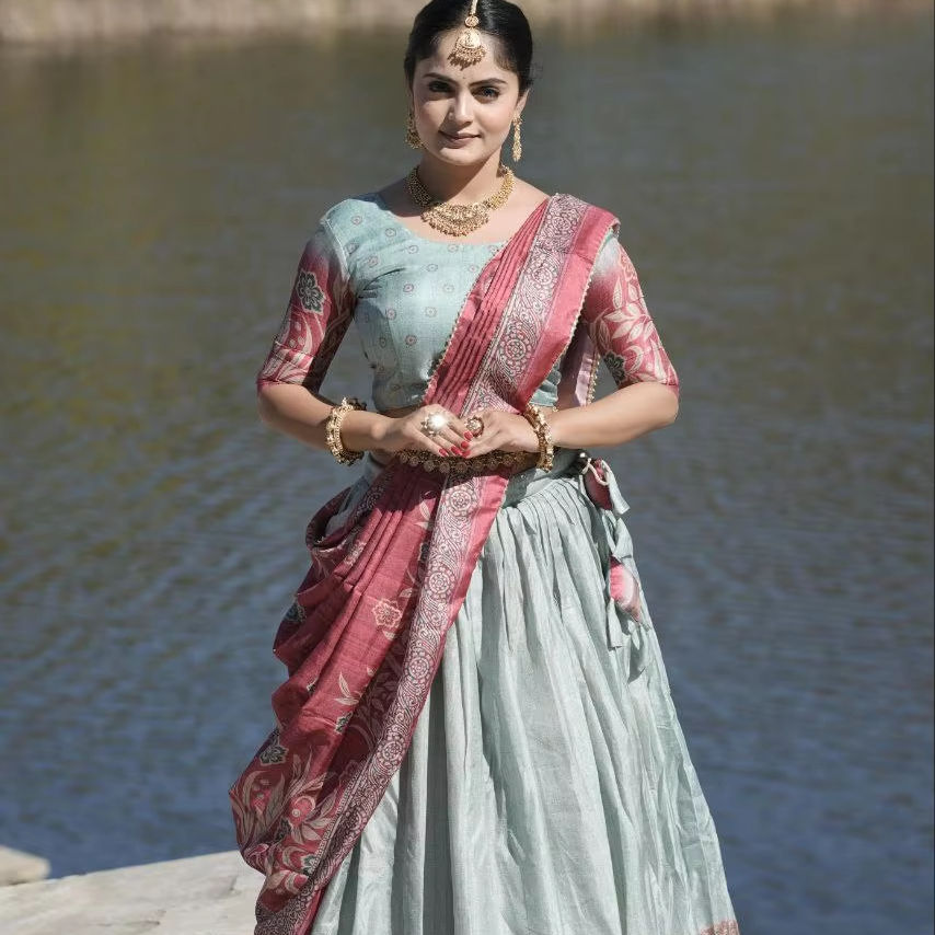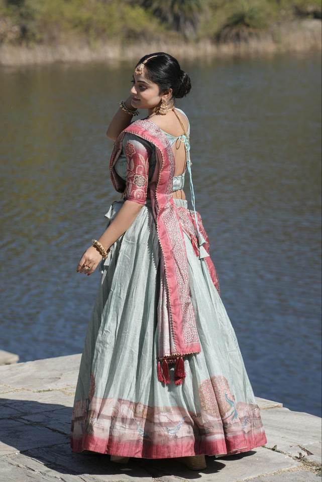 Lehenga Choli imprimé en soie de Manipuri pure de couleur bleu ciel avec Can-Can pour une tenue de fête de mariage traditionnelle
