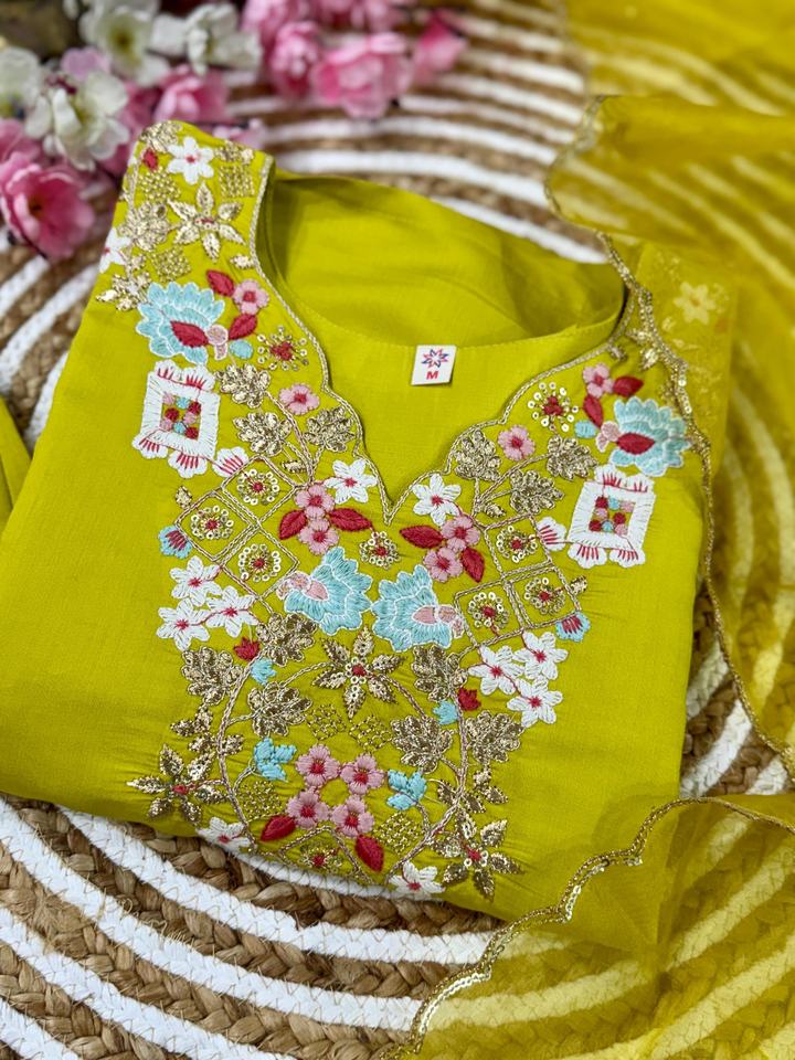 Dernière soie de chinon élégante avec broderie exquise et travail de séquence Kurti Set par Grootin