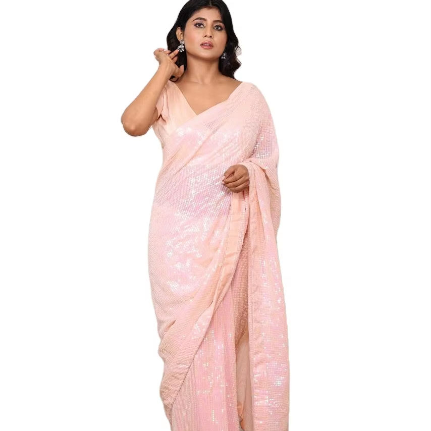 Le saree de travail multi-séquences de broderie de couleur rose en georgette lourde à la mode offre une élégance intemporelle au prix de gros