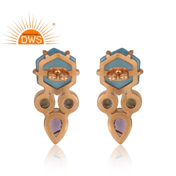 Dernière conception faite à la main en laiton plaqué naturel calcédoine bleue labradorite et hydro améthyste fabricant de boucles d'oreilles en pierres précieuses