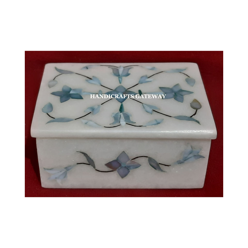 Boîte à bijoux rectangulaire en marbre blanc avec incrustations de fleurs faites à la main et de nacre rose, idéale pour Thanksgiving