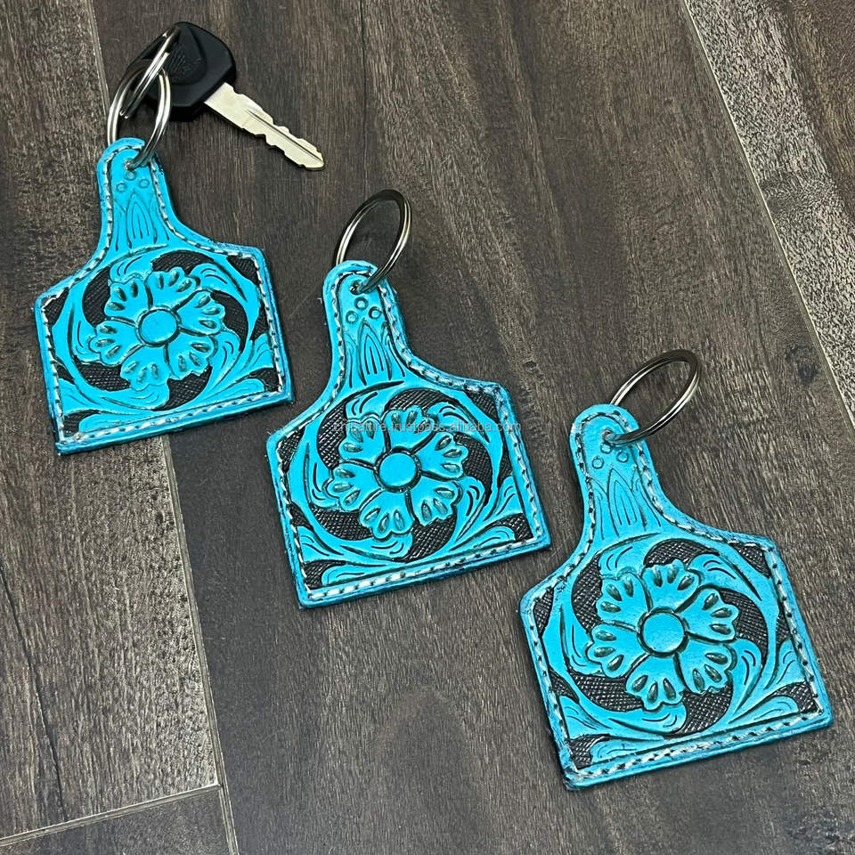 Porte-clés en cuir de vachette artisanal, motif western, turquoise, sculpté, accessoire pour sacs et clés