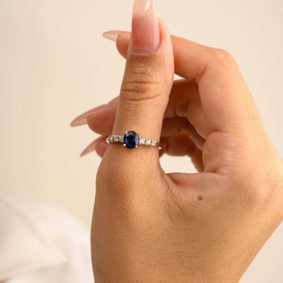 Bague délicate en or blanc massif 14 carats, saphir Blie naturel taillé ovale et diamant de qualité supérieure 100%, bijoux fins
