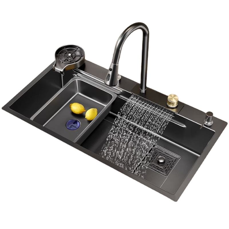 Évier de cuisine nano tendance, rectangulaire, en acier inoxydable noir, à cuve unique, avec robinet, à encastrer sous le plan.