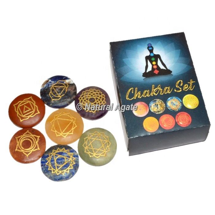Dernière vente en gros de haute qualité sept Chakra cristal rond ensemble de pierres de guérison gravé avec boîte en bois Chakra Stone Meditation Box