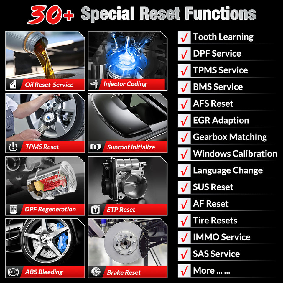 11 fonction spéciale:Frein/Huile/ABC Purge/Engrenage/SAS/BMS/TMPS/ETS/INJEC/DPF/IMMO Réinitialiser