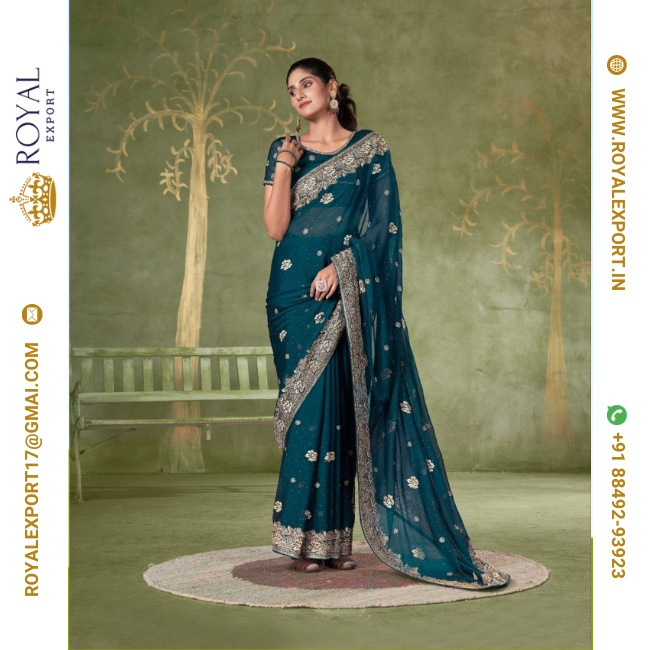 Lancement d'un designer exquis en mousseline de soie lourde avec broderie, fabricant de collection Saree par Royal Export à Surat Gujarat