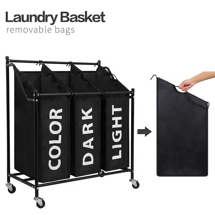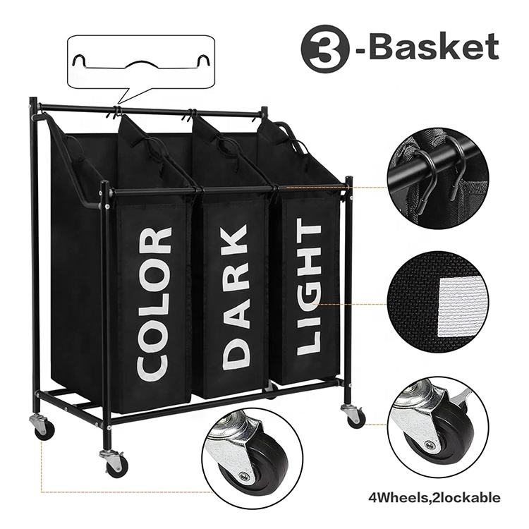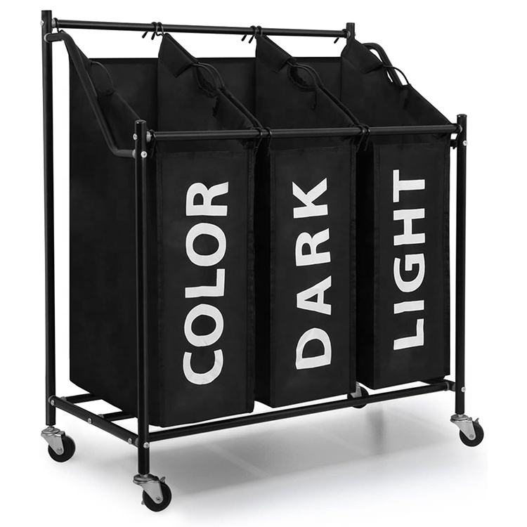 Paniers à linge Trieur à linge sur roues Poubelle à linge avec 3 sacs en tissu amovibles Cadre en métal 3X45 L Noir