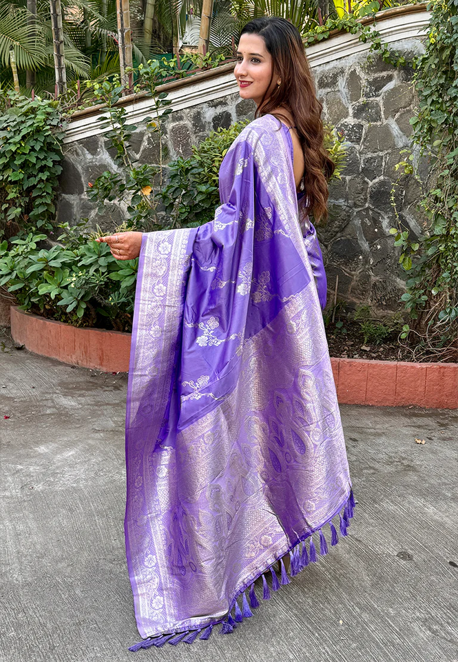 Lavender Banarasi Jaal Soft Silk Saree With Delicate Zari Weaving Ideal For Weddings Festive Occasions And Elegant Traditional