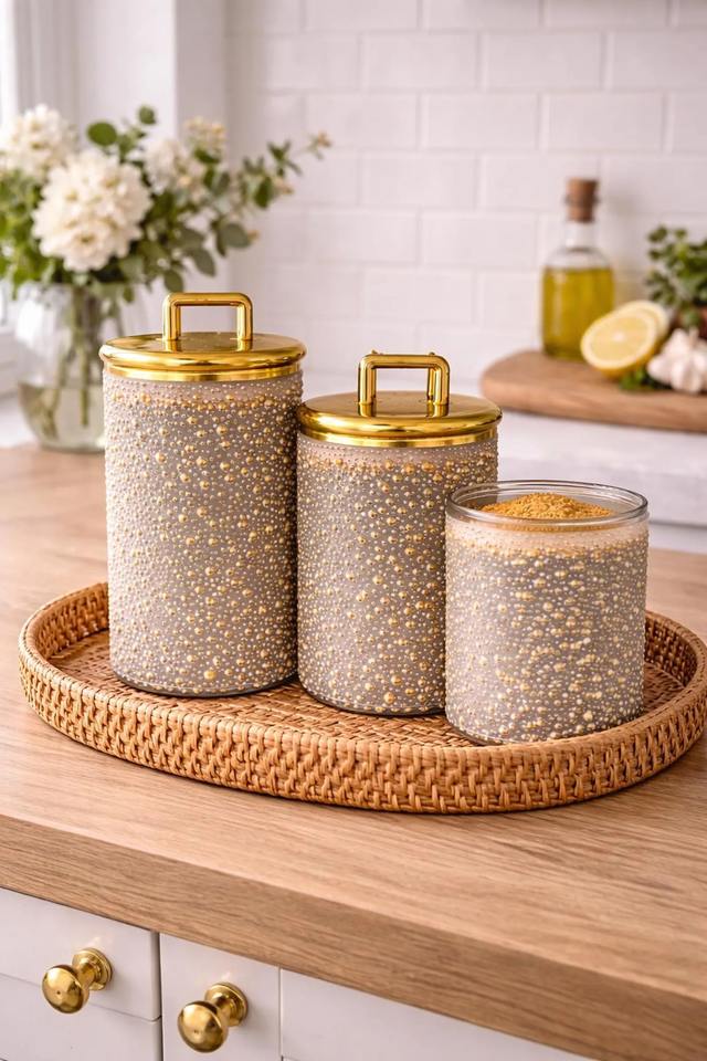 Contenants métalliques de luxe avec couvercle doré, bocaux de rangement de cuisine haut de gamme pour améliorer l'ensemble de la décoration et la présentation de la cuisine.