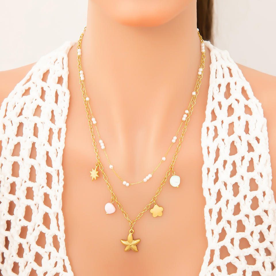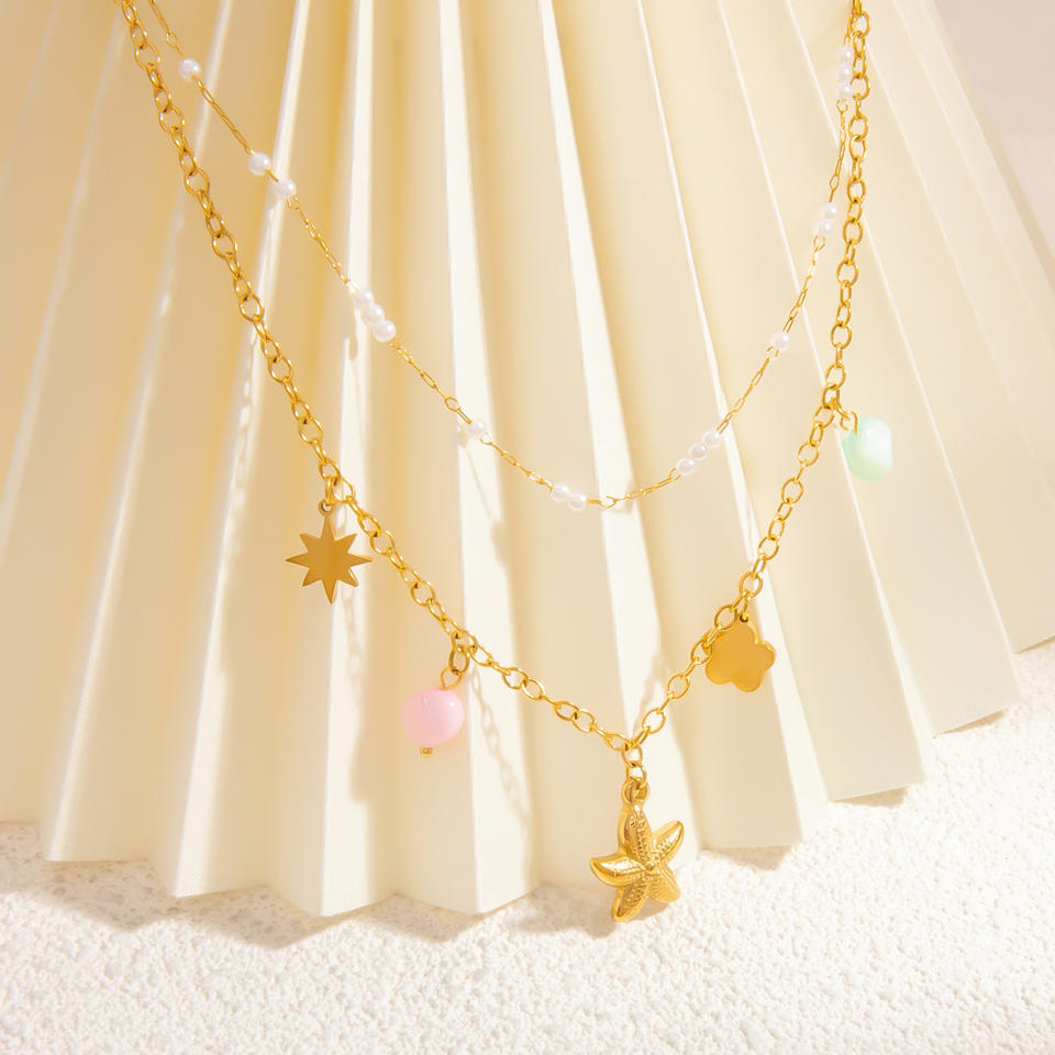 Collier superposé en fausses perles avec breloques étoiles, chaîne de clavicule en acier titane plaqué or 18 carats pour femme, bijoux tendance