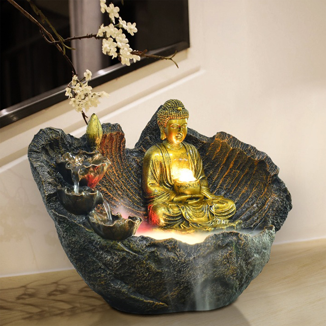 Fontaine d'eau en résine dorée de style sud-est asiatique avec statue de Bouddha, décoration durable pour salon ou bureau