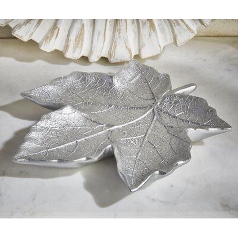 Plateau de service décoratif en métal argenté motif feuille, en acier inoxydable et aluminium, léger et moderne, pour mariage