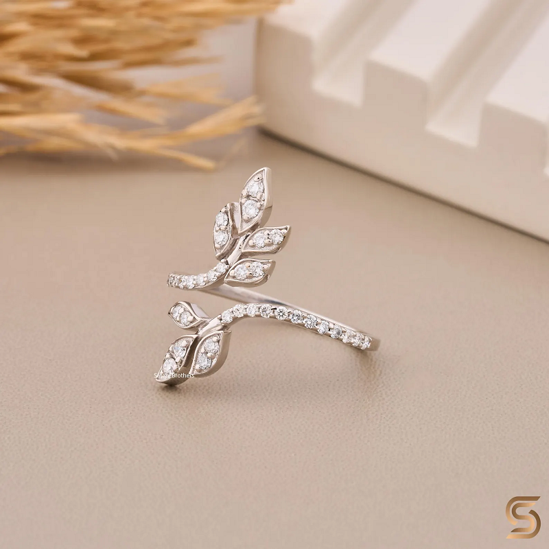 Bague ouverte en or blanc 18 carats avec diamant de laboratoire inspiré des feuilles, motif vigne naturelle, 0,3 carat, pour fiançailles, mariage, anniversaire