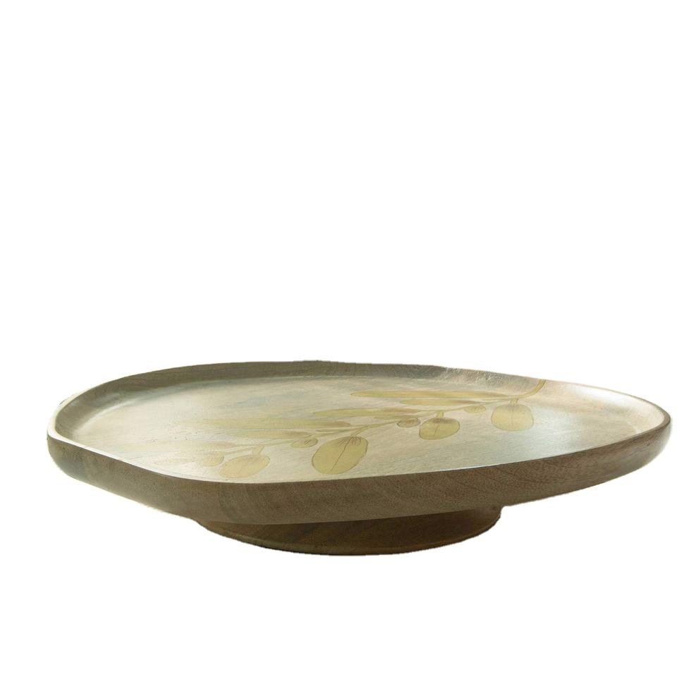 Coffre-fort alimentaire de présentoir de désert imprimé par modèle de feuille de piédestal de gâteau en bois de mangue solide avec le revêtement imprimé sur la surface supérieure
