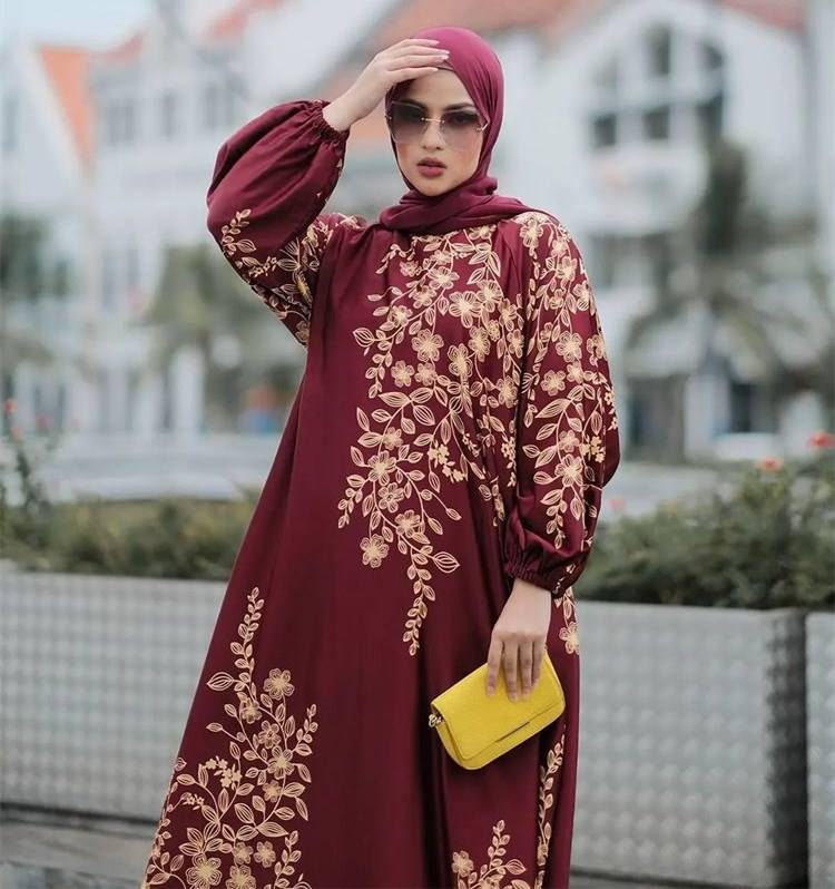 Robe Abaya Musulmane Traditionnelle en Soie Arabe Qish Rouge à Motif de Feuilles d'Arbre Dubaï Jubah Marocain