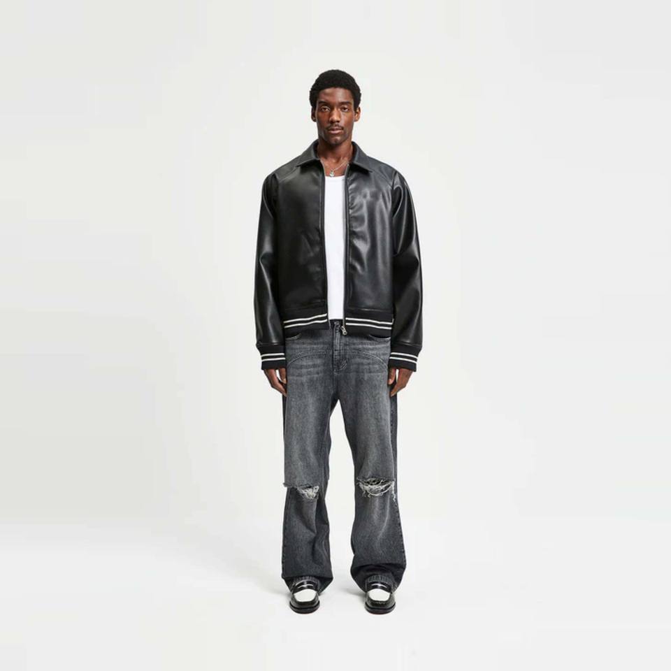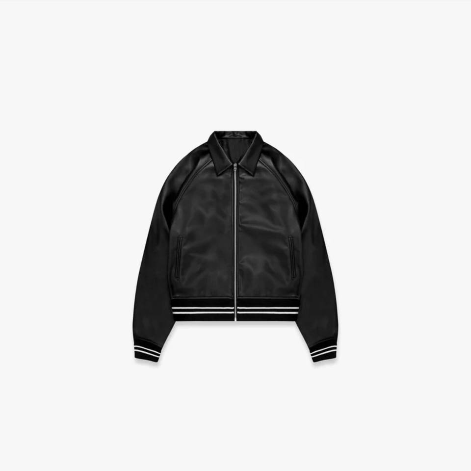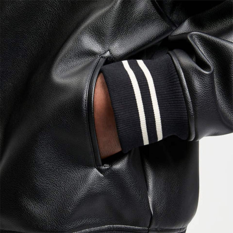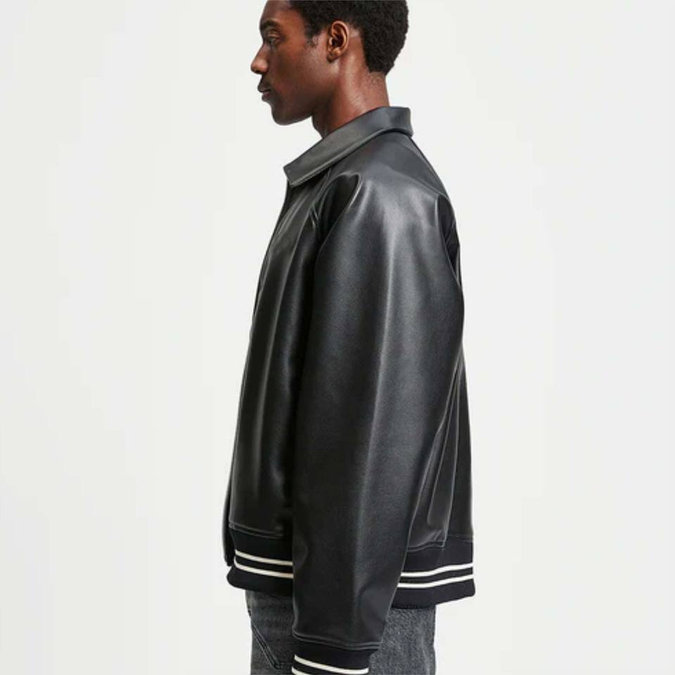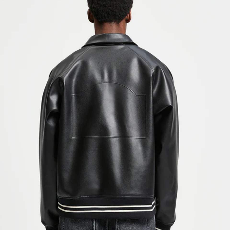 Leather Bomber Jacket Black, Vegan Leather with Embossed Back Design, Ribbed Cuffs, and Zipper