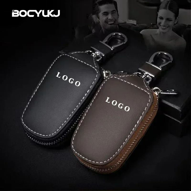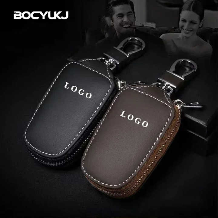 Étui clé voiture cuir vachette 14×5,5×2,7cm noir/marron logo 3D compatible BMW/Mercedes/Audi/VW/Toyota/Honda/Hyundai/Kia/Ford x1