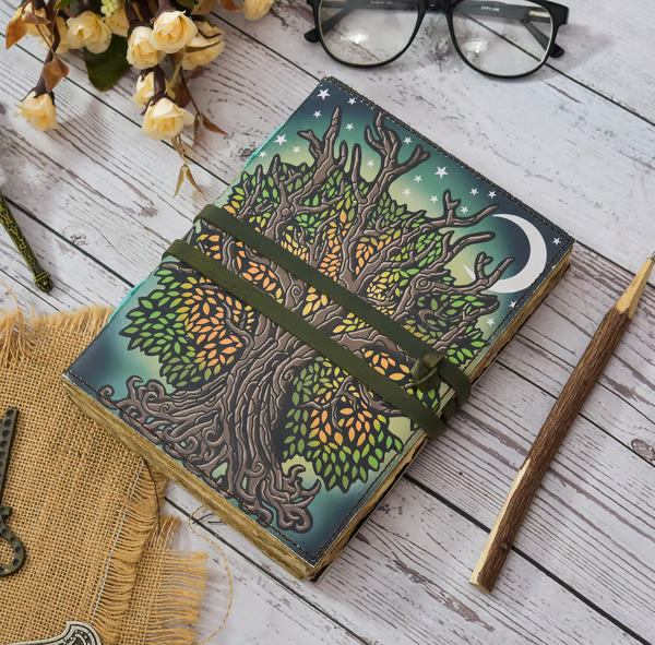 Carnet en cuir Eternal Roots avec couverture rigide et papier à bords frangés vierges pour l'écriture, le dessin et l'usage quotidien