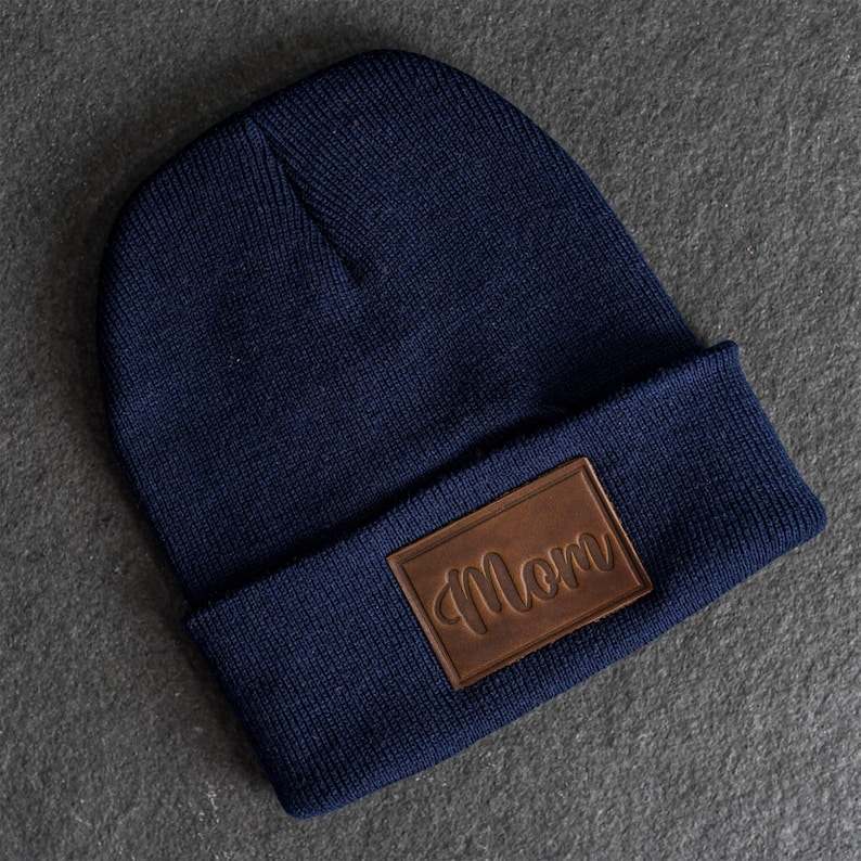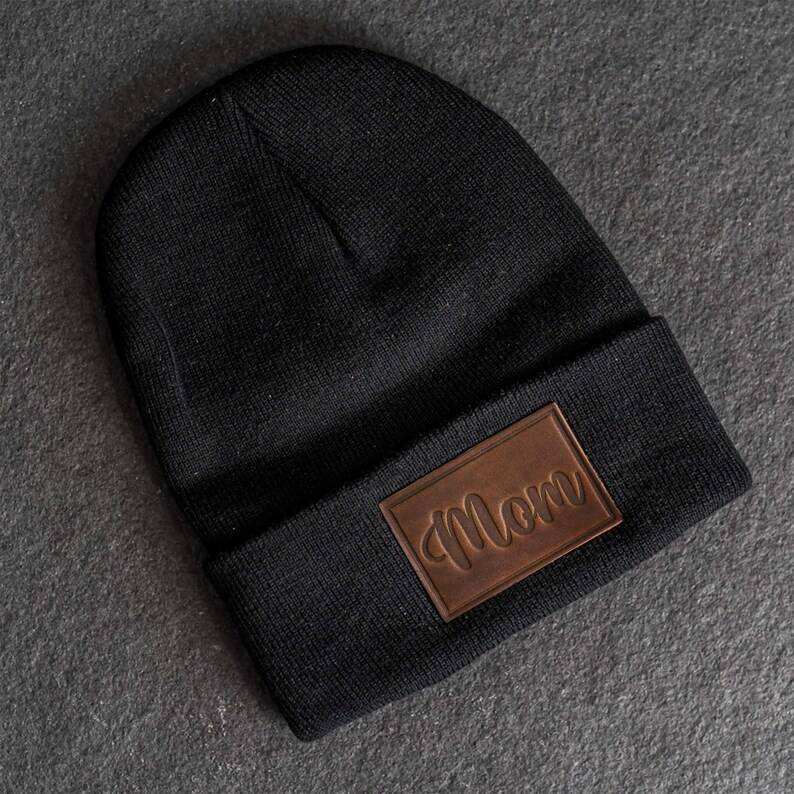 Bonnet en cuir avec inscription « Mom » en cursive, bonnet d'hiver chaud en tricot, logo personnalisé, bonnet en cuir PU pour femmes