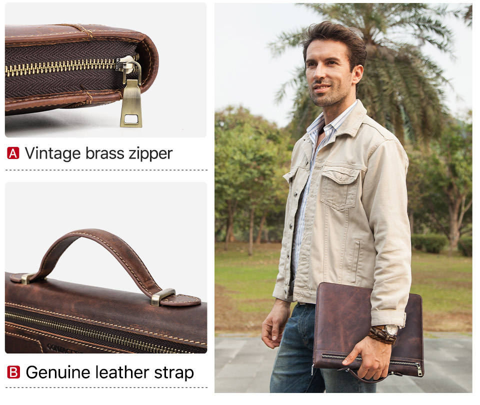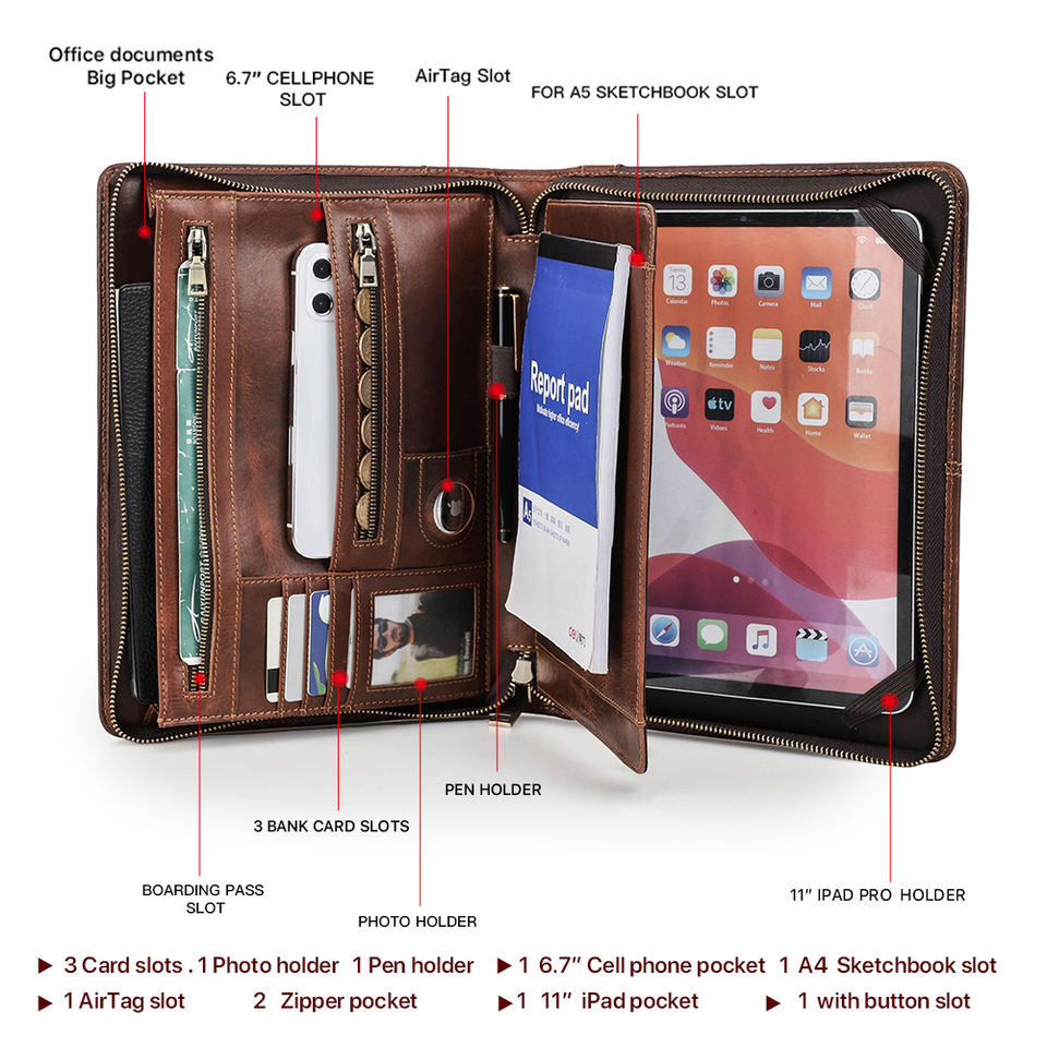 Leather Zipper Padfolio Business Multi Pocket Leather Folder Organizer Case 11" iPad Tablet Sleeve for Airtag Slot Cover CF2034R