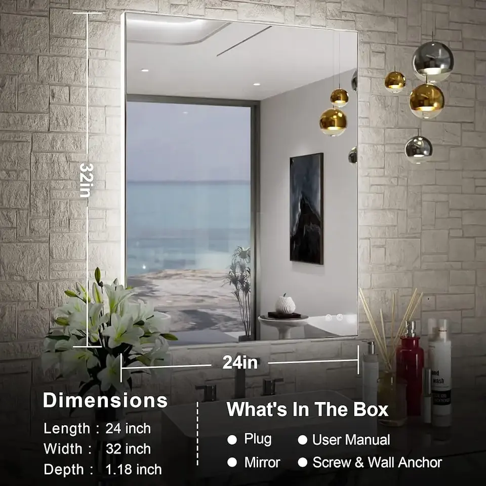 Miroir de courtoisie de salle de bain rétroéclairé par LED, anti-buée, à intensité variable, bouton tactile, étanche, montage mural horizontal/vertical