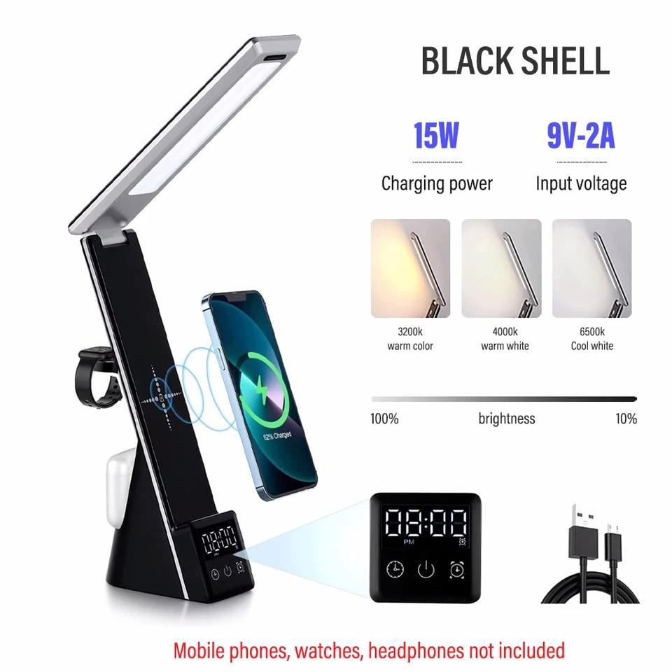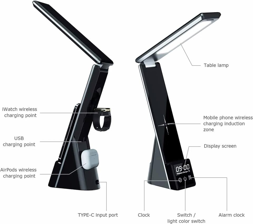 Lampe de bureau LED avec réveil, 3 températures de couleur, gradation progressive, chargement USB, veilleuse, protection des yeux, lampes de lecture de table